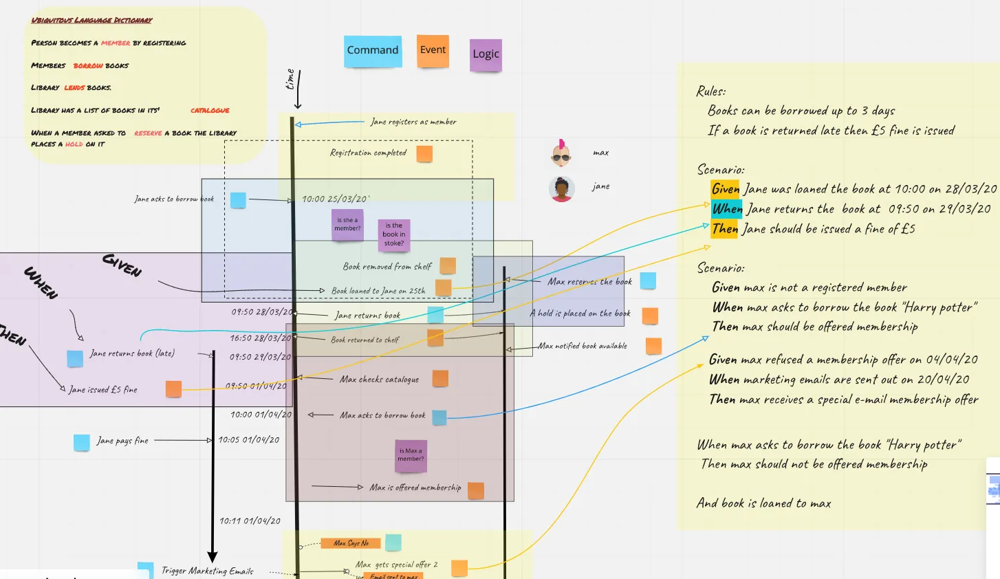 As the number of scenarios grows, the ubiquitous language of the domain (see DDD) will gradually come into sharper focus. Which book was loaned? At what time? So you say that a member “reserves a book” but that the Library “puts a book on hold”?